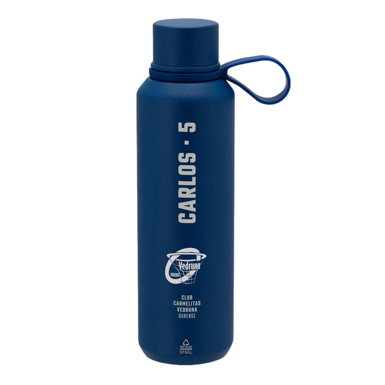 Bidón térmico de 630 ml fabricado en acero inoxidable reciclado de doble pared, con acabado mate y asa de silicona a juego. Mantiene las bebidas frías o calientes durante horas, sin condensación ni fugas. Libre de BPA y con distintivo de acero reciclado, es una elección responsable y duradera. El escudo del CC Vedruna luce con carácter y puedes personalizarla con tu nombre o dorsal. Presentada en caja kraft reciclable, demuestra que apoyar al club también puede hacerse con estilo.
