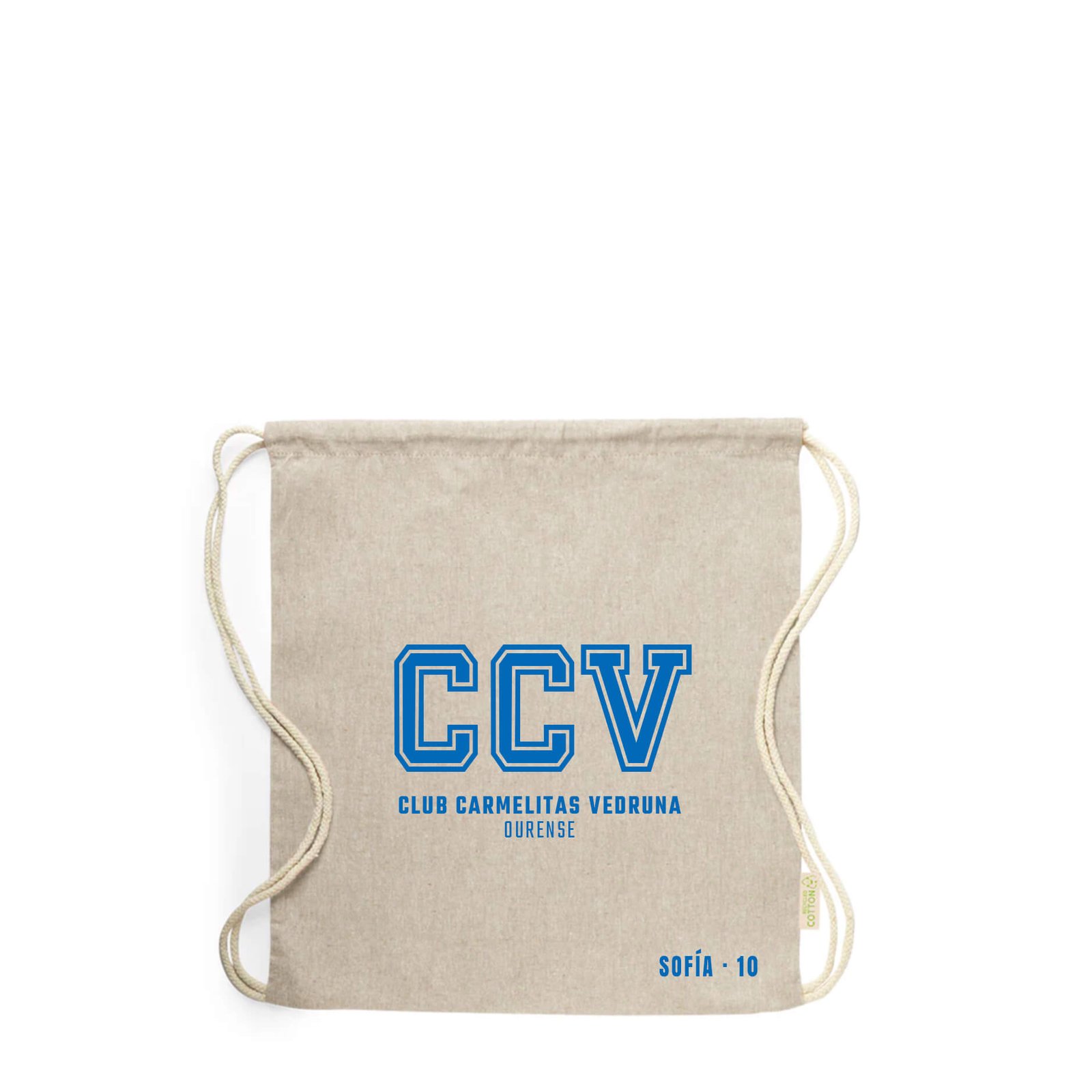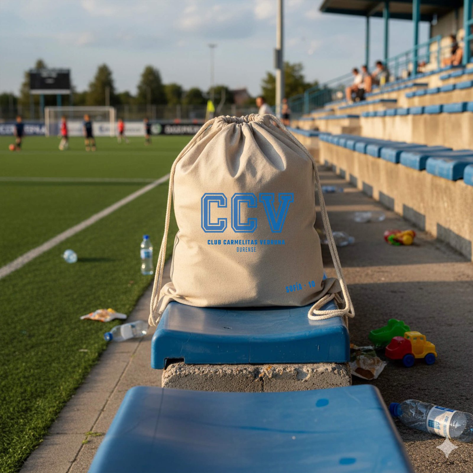 Mochila de cuerdas elaborada con algodón reciclado de 120 g/m². El diseño con las iniciales CCV estampadas en el frontal transmite orgullo y pertenencia con un toque moderno. Sus cordones de algodón garantizan un cierre cómodo y seguro; perfecta para ropa deportiva, material escolar o lo que necesites. Personalízala con tu nombre o dorsal y añádele exclusividad. Ligera, resistente y comprometida con el medio ambiente: un básico que acompaña cada entrenamiento.
