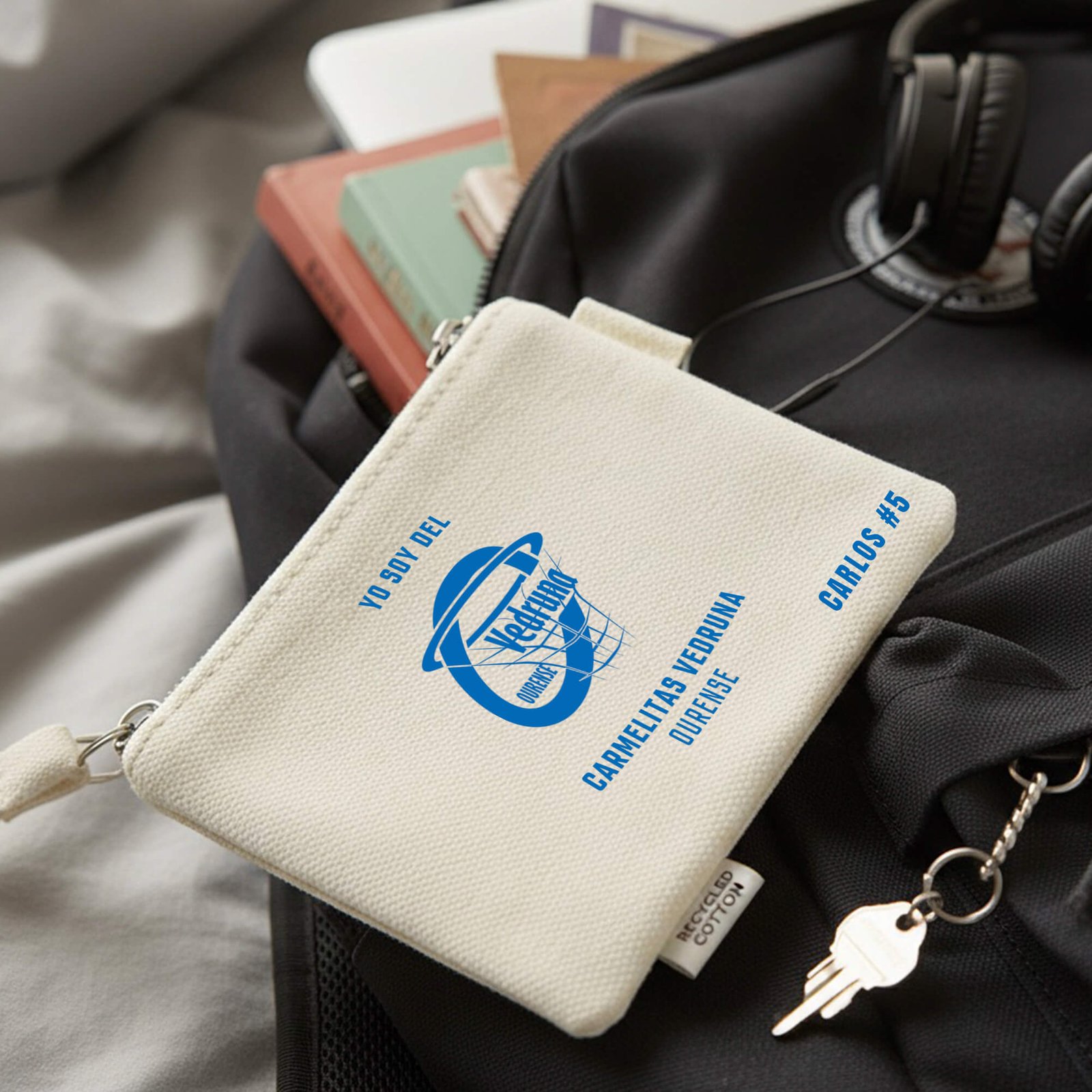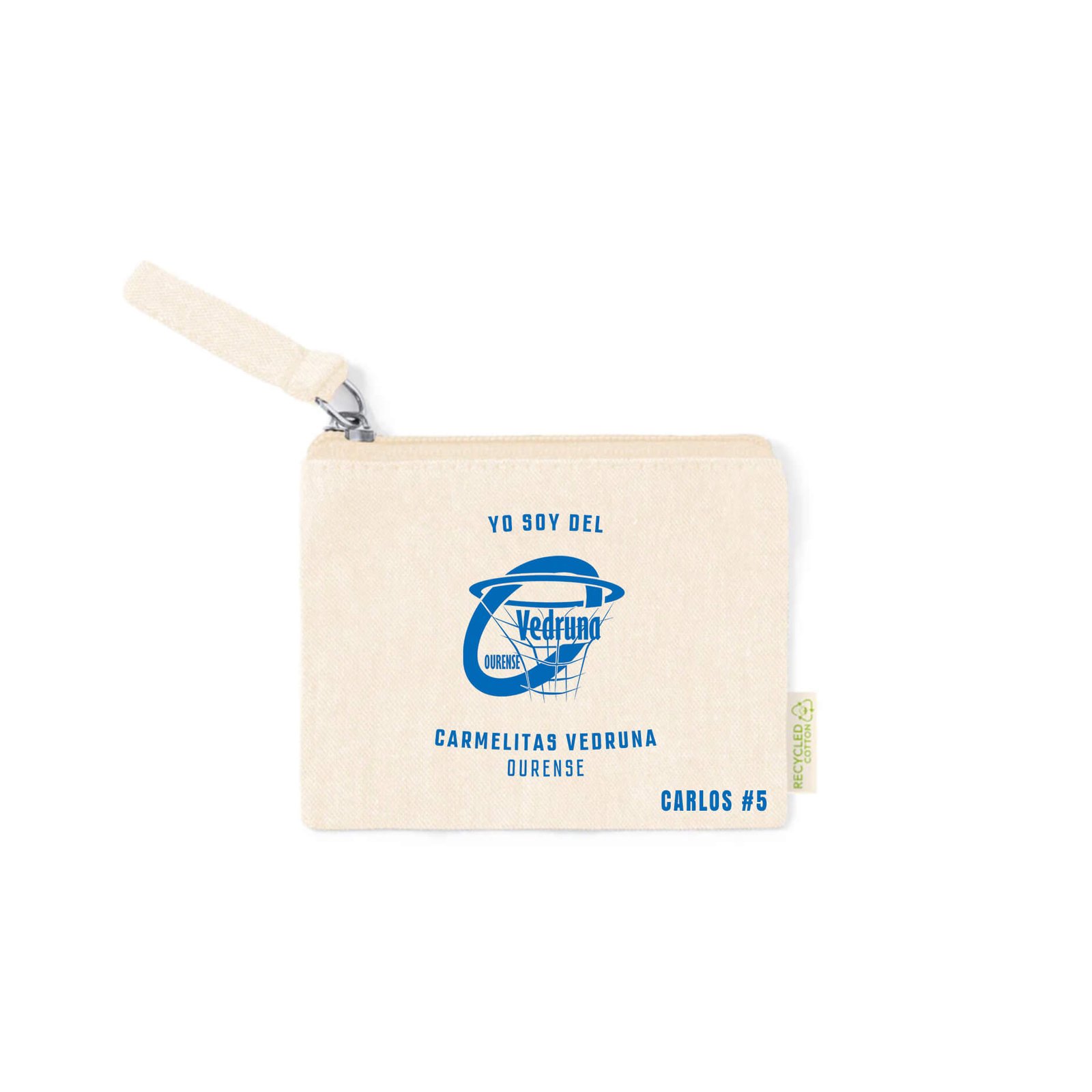 Fabricado en algodón reciclado certificado GRS, este monedero combina practicidad y sostenibilidad. Su diseño natural resalta el escudo del CC Vedruna en el frontal, con cierre de cremallera y tirador a juego. Compacto, pero con espacio para monedas, llaves o pequeños objetos, es ideal para el día a día o como detalle en eventos del club. Personalízalo con tu nombre o dorsal y conviértelo en un accesorio único que refleja compromiso y pertenencia.
