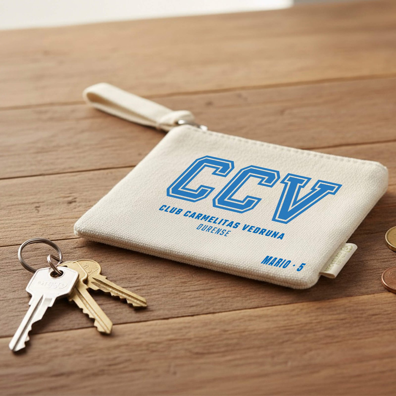 Elaborado con algodón reciclado GRS, este monedero es tan funcional como elegante. Presenta las iniciales CCV en el frontal, una forma discreta de llevar contigo el espíritu del club. Cierre de cremallera reforzado, costuras sólidas y tacto suave que transmite calidad. Perfecto para monedas, auriculares o pequeños objetos personales. Personalízalo con tu nombre o dorsal y convierte un accesorio cotidiano en un detalle único. Ligero, duradero y con historia.