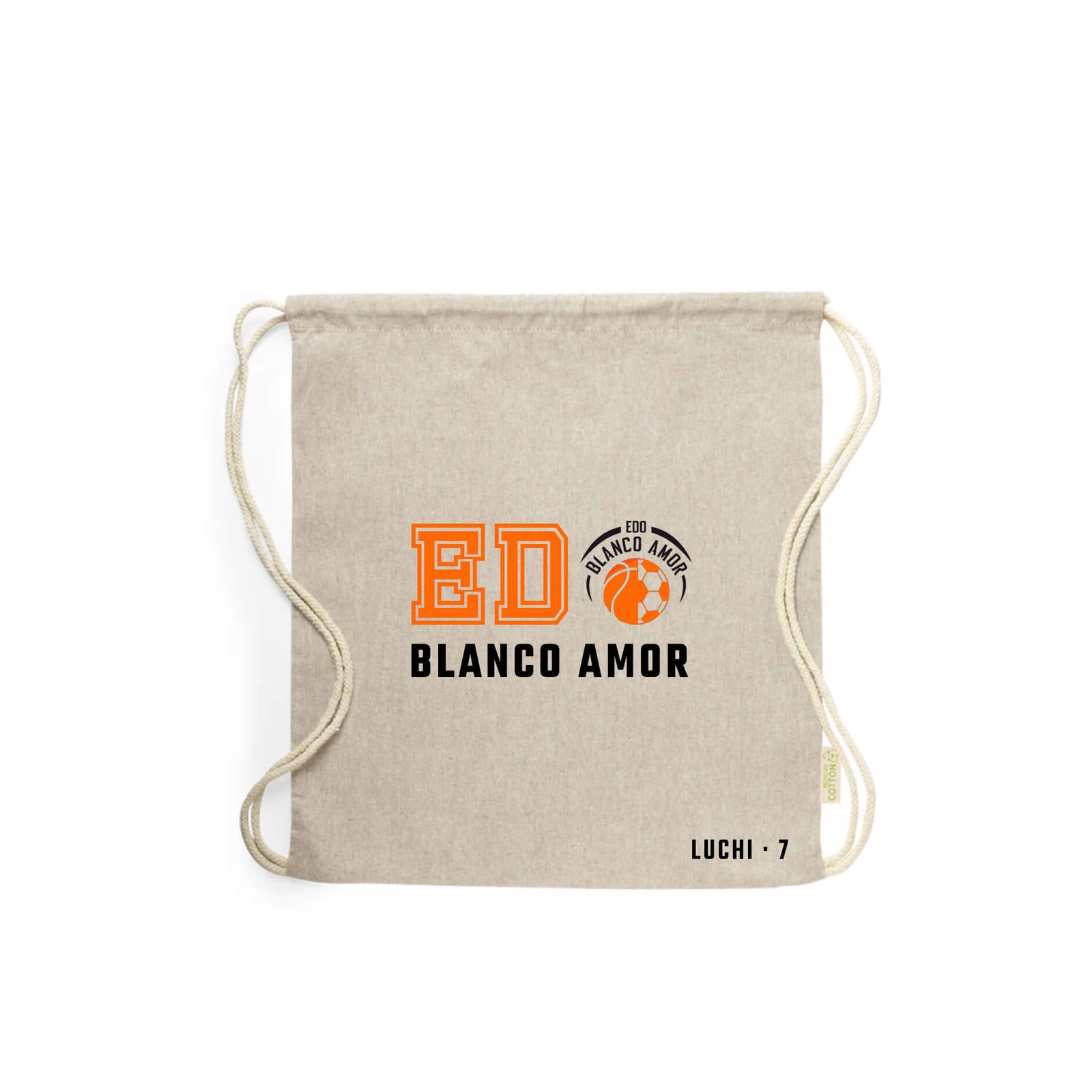 Mochila de cuerdas elaborada con algodón reciclado de 120 g/m². El diseño con las iniciales BC estampadas en el frontal transmite orgullo y pertenencia con un toque moderno. Sus cordones de algodón garantizan un cierre cómodo y seguro; perfecta para ropa deportiva, material escolar o lo que necesites. Personalízala con tu nombre o dorsal y añádele exclusividad. Ligera, resistente y comprometida con el medio ambiente: un básico que acompaña cada entrenamiento.