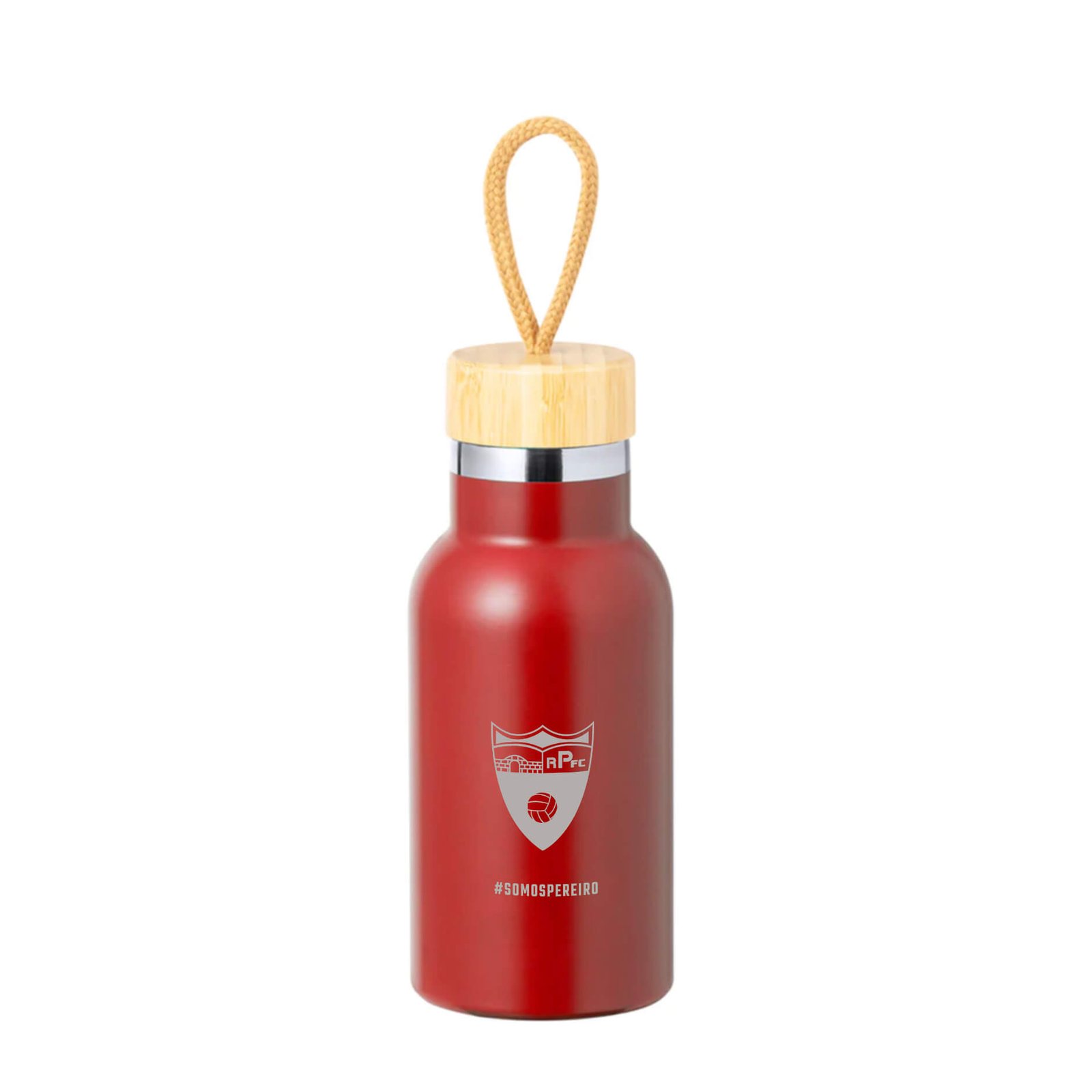 El tapón con asa natural facilita su transporte, y el acabado satinado con el escudo del Rápido de Pereiró aporta un toque elegante.