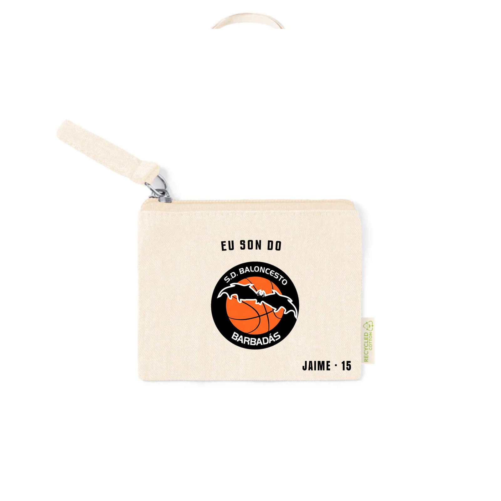 Fabricado en algodón reciclado certificado GRS, este monedero combina practicidad y sostenibilidad. Su diseño natural resalta el escudo del SD Baloncesto Barbadás en el frontal, con cierre de cremallera y tirador a juego. Compacto, pero con espacio para monedas, llaves o pequeños objetos, es ideal para el día a día o como detalle en eventos del club. Personalízalo con tu nombre o dorsal y conviértelo en un accesorio único que refleja compromiso y pertenencia.