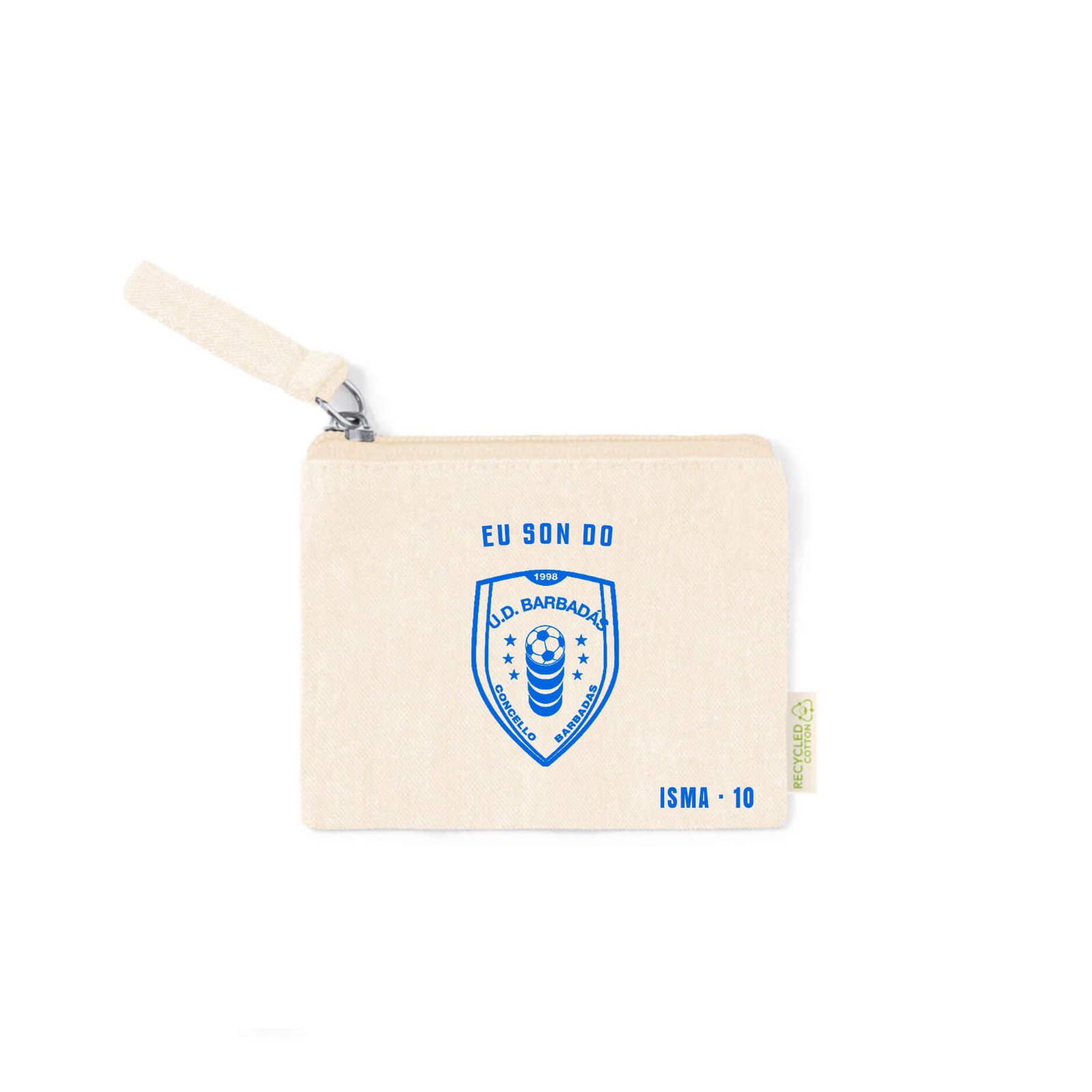 Fabricado en algodón reciclado certificado GRS, este monedero combina practicidad y sostenibilidad. Su diseño natural resalta el escudo del UD Barbadás en el frontal, con cierre de cremallera y tirador a juego. Compacto, pero con espacio para monedas, llaves o pequeños objetos, es ideal para el día a día o como detalle en eventos del club. Personalízalo con tu nombre o dorsal y conviértelo en un accesorio único que refleja compromiso y pertenencia.